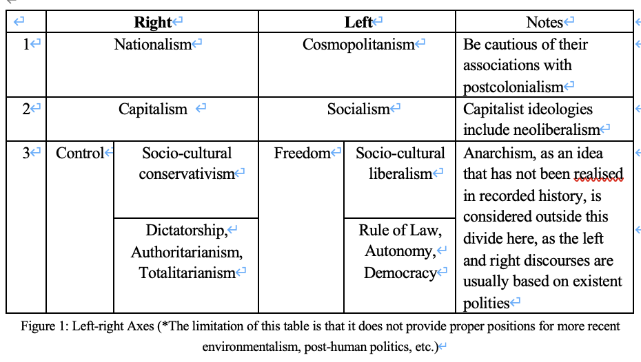 The left and right divide is often situated in the ‘political values’, while the latter parallels the Treaty of Lisbon triad, which are: democracy, human rights, and the rule of law(Renouard, 2020). Nonetheless, the political axes I deploy for this binary are from a more specific angle of pragmatics – to put it another way, the daily usage of language in dialectical discourses. In this discursive inspection, there are three axes between the post-cold-war ‘left and right’:Greater Connections of Different Axes Beyond National Binary Systems